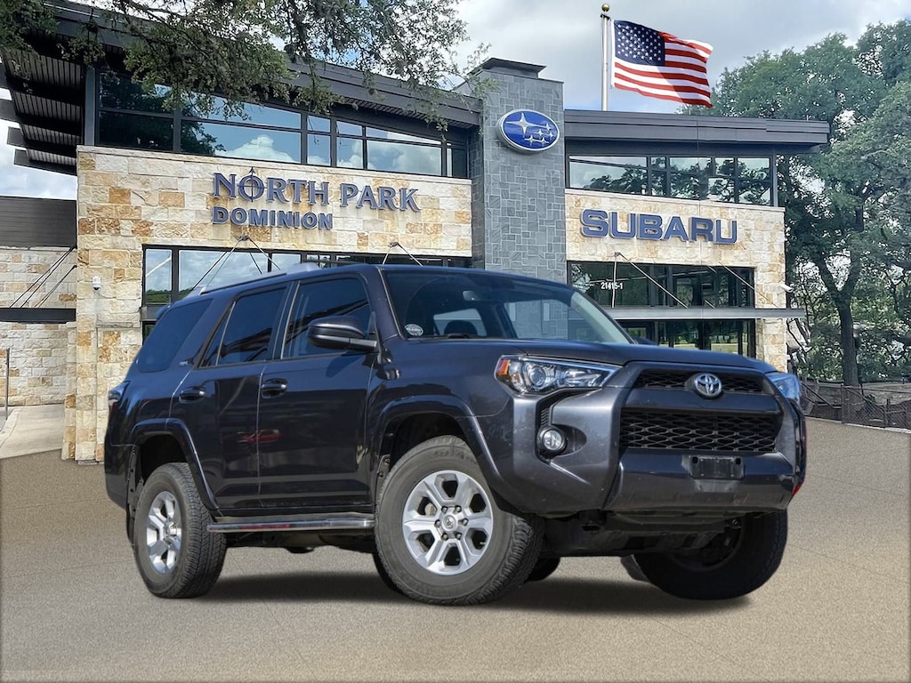 Disclaimer: Please contact us to confirm vehicle availability and pricing. North Park Subaru at Dominion is honored to offer this wonderful-looking 2018 Toyota 4Runner SR5. Well equipped with 17" x 7.0" 6-Spoke Alloy Wheels, 3.727 Axle Ratio, 4-Wheel Disc Brakes, 8 Speakers, ABS brakes, Air Conditioning, Alloy wheels, AM/FM radio: SiriusXM, Anti-whiplash front head restraints, Brake assist, Bumpers: body-color, CD player, Driver door bin, Driver vanity mirror, Dual front impact airbags, Dual front side impact airbags, Electronic Stability Control, Emergency communication system: Safety Connect, Exterior Parking Camera Rear, Front anti-roll bar, Front Bucket Seats, Front Center Armrest, Front fog lights, Front reading lights, Front wheel independent suspension, Heated door mirrors, Illuminated entry, Knee airbag, Leather Shift Knob, Leather steering wheel, Low Fabric Seat Trim, Low tire pressure warning, Occupant sensing airbag, Outside temperature display, Overhead airbag, Overhead console, Panic alarm, Passenger door bin, Passenger vanity mirror, Power door mirrors, Power driver seat, Power steering, Power windows, Radio: Entune Audio Plus, Rear anti-roll bar, Rear seat center armrest, Rear window defroster, Rear window wiper, Remote keyless entry, Roof rack: rails only, Security system, Speed control, Speed-sensing steering, Split folding rear seat, Spoiler, Steering wheel mounted audio controls, Tachometer, Telescoping steering wheel, Tilt steering wheel, Traction control, Trip computer, and Variably intermittent wipers.